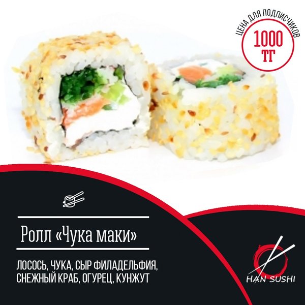 Лосось + угорь + сыр Филадельфия + снежный краб + огурец + салат Чука + кунжут = Ролл Чука. А вы уже решили это уравнение? Сделать заказ вы можете на сайте ___________________________________________________