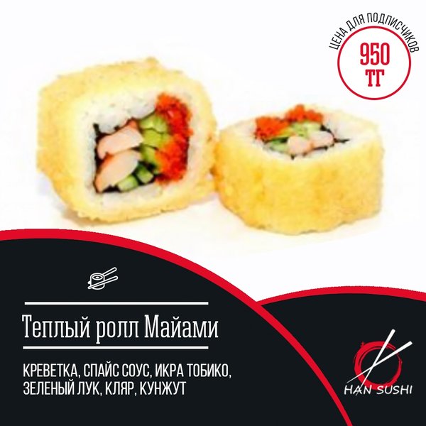 Теплый Ролл Майами, состоящий из креветки, соуса спайс, икры тобико, зеленого лука, кляра и кунжута, гарантирует — вкусно будет всем! Мы ждем вашего заказа на сайте! ___________________________________________________