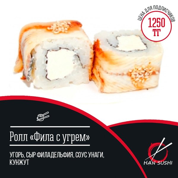 Устали от обычного ролла «Филадельфия» и хочется разнообразия? Выход есть! Попробуйте ролл «Фила с угрем», он вам обязательно понравится! Сделать заказ можно на сайте _________________________________________________
