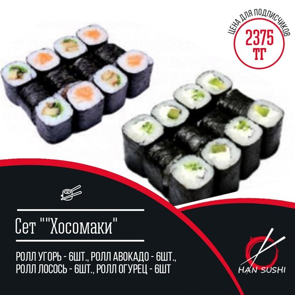 Почитателям классического вкуса точно понравится сет «„Хосомаки“ от Hansushi. В нем вы встретите роллы угорь, лосось, ролл авокадо и ролл огурец. Ждем заказы на нашем сайте: ___________________________________________________