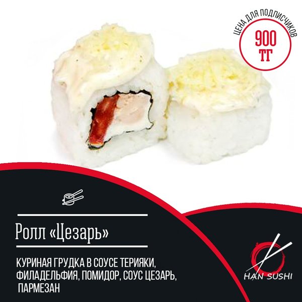 Ролл Цезарь — яркий и необычный! Состоящий из копченной курицы,, помидора, чесночного соуса, моцареллы, сыра филадельфия, он внесет новые краски в ваше представление о японской кухне! Заказать ролл Цезарь можно, просто перейдя по ссылке _________________________________________________