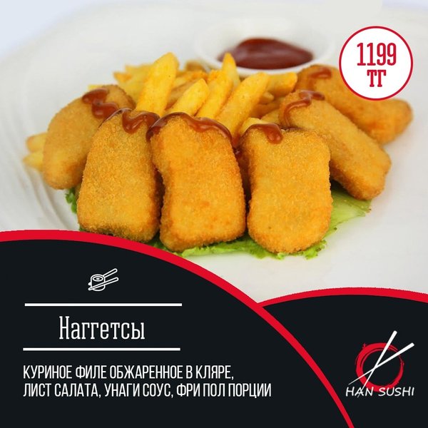 А вы знали, что наггетсы начали готовить в Америке и на сегодняшний день существует более 100 различных рецептов их приготовления! Ну еще бы: они просто восхитительны. Нежная курочка в хрустящей панировке Кстати, на нашем сайте в разделе «Супы и салаты» вы найдете невероятно вкусные наггетсы по очень заманчивой цене! ___________________________________________________