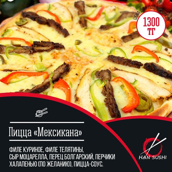 Яркая, острая и насыщенная пицца «Мексикана» от Hansushi готова подарить вам по настоящему жаркий вечер! Заказать ее вы можете на сайте ___________________________________________________
