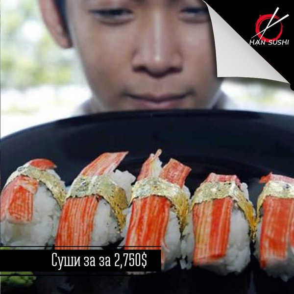 Самые дорогие суши в мире сделаны с 20 каратными африканскими алмазами и обернуты 24-каратным золотым листом — отсюда и такая цена за порцию в 4 ролла. Эта неправдоподобно роскошная еда доступна в Маниле за 2,750$. __________________________________________________