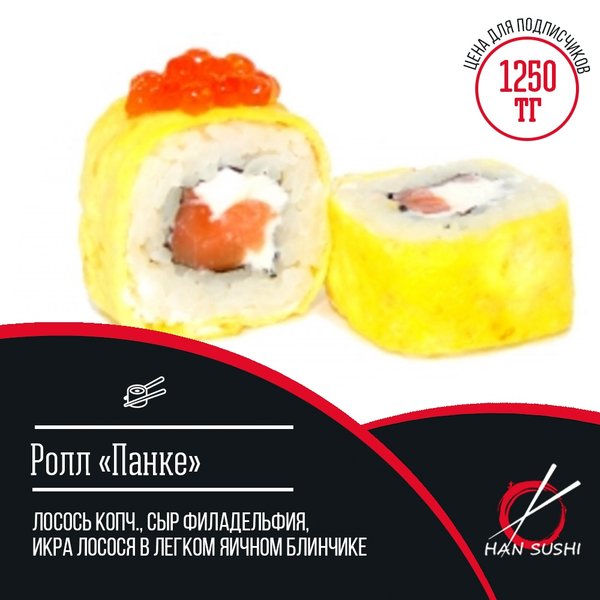 Восхитительный ролл «Панке», спешит порадовать вас своим потрясающим вкусом! Его ингредиенты, копченый лосось, сыр Филадельфия, икра лосося в легком яичном блинчике идеально сочетаются и несут в себе неподдельное удовольствие! Сделать заказ вы можете на сайте _________________________