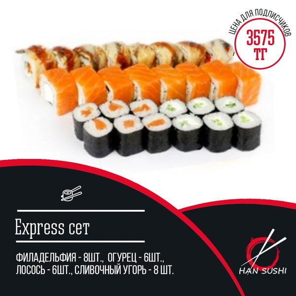 Порадуйте любимого мужчину ужином в японском стиле! Express сет состоящий из 4 роллов: «Филадельфия», ролла «Огурец», ролл «Лосось», ролла «Сливочный угорь». Не только не оставит вас голодными, но и побалует превосходным вкусом, настоящей, японской кухни! Ждем вашего заказа на сайте ___________________________________________________