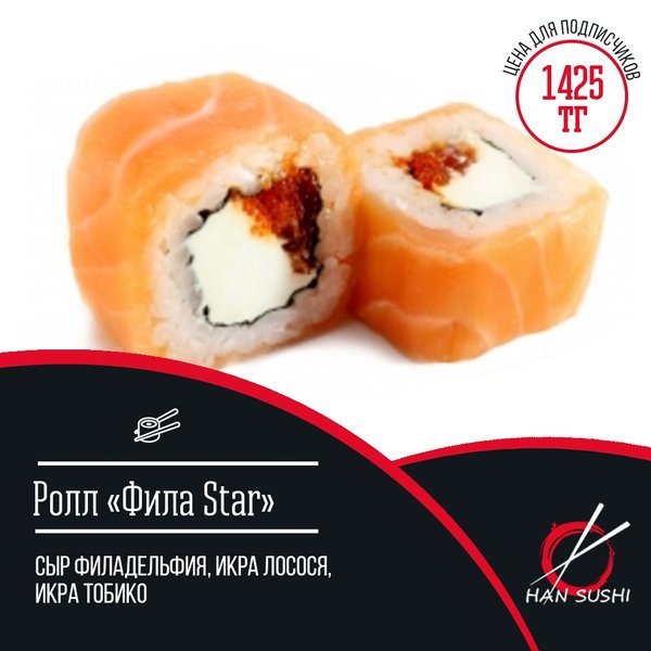 Ролл Фила STAR – сливочный сыр Филадельфия, икра тобико, питательное и нежное филе лосося. Заказывайте на нашем сайте: __________________________________________________