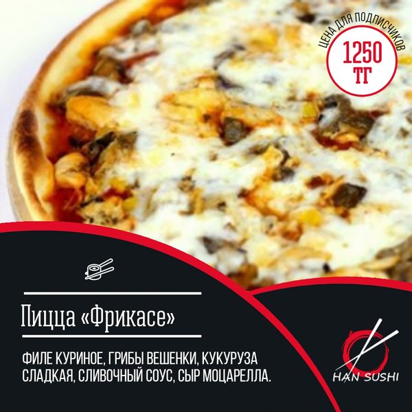 Соблазнительная пицца «Фрикасе», состоит из куриного филе, вешенок, сладкой кукурузы, сливочного соуса и сыра моцарелла. Эта невероятно вкусная пицца ждет вашего заказа на сайте ___________________________________________________