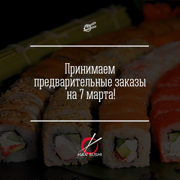 Друзья, а вы уже думали как будете отмечать главный женский праздник на рабочем месте? Если в ваши планы входят пицца и роллы, то у нас для вас новость! В Hansushi начинается прием предварительных заказов на 7 марта! Оформить предзаказ можно на сайте или по телефонам, _________________________________________________