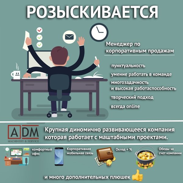 нию, проведение переговоров Налаживание отношений и сотрудничество со всеми участниками рабочего процесса. (партнеры, клиенты, сотрудники). Контроль за дебиторской задолженностью. Требования: Опыт в продажах Обязателен опыт работы, связанный с продажей ТОВАРОВ в В2В. Умение работать эффективно с входящими лидами и базой постоянных клиентов. Опыт работы в CRM будет преимуществом, но не обязательно. Отличные управленческие и организационные навыки. Аналитические способности, системность. Настойчивость в достижении результатов. Условия: Мотивация: оклад +%. Официальное трудоустройство по ТК РК. График работы: 5/2 с 09:00 ч. - 18:00 ч; Современный и комфортный офис. Корпоративная мобильная связь; Компенсация ГСМ; Обеды за счет компании; Возможность профессионального роста. ------------------------------------------------------------------ ПО ВСЕМ ВОПРОСАМ СЮДА⤵️ E-Mail: office@admms.kz Телефон: