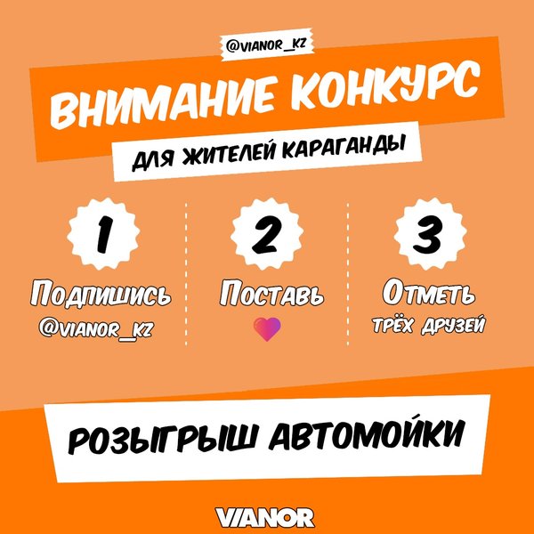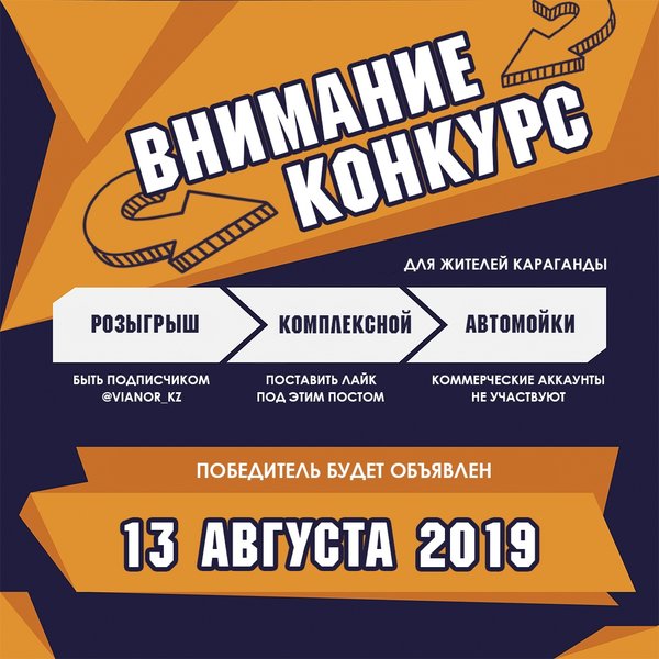 Внимание автолюбители Запускаем ещё один конкурс, ТОЛЬКО для жителей Караганды 1️⃣ место: Комплексная мойка вашего автомобиля 2️⃣ и 3️⃣ место: 20% скидочный купон на автомойку Условия розыгрыша: Быть подписчиком @vianor_kz Поставить ️ под постом Отметить троих друзей в комментарии ️ 27 августа 2019 года мы выберем победителя с помощью генератора случайных чисел. Количество комментариев не ограничено Увеличь свой шанс на победу! Коммерческие аккаунты не участвуют