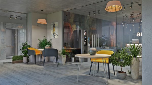 ть несколько разных зон для проведения времени наедине с собой, либо переговоров с клиентом. Ещё есть удобная барная стойка для работы или беседы. Саму комнату для занятий йогой мы совместили с комнатой обучения. Когда заканчивается обучение, все стулья собираются, меняется освещение (а приглушённый свет очень важен для йоги!) и комната превращается в зал для йоги! А еще у нас там будет настольный футбол, кухня, выполненная в стиле кофейни, и две раздевалки с душевыми кабинами. Основные используемые цвета — серый цвет бетона, желто-рыжий цвет кирпича и классическое дерево. Своего рода, лучи солнца среди повседневной рутины в бетонных джунглях города.... В целом, на наш взгляд, помещение получилось необычным, комфортным для работы и интересным для посещения. Покажите своим коллегам и руководителям, каким может быть офис мечты))) Указывайте их в комментариях!
