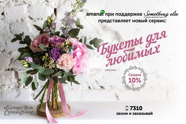партнеров студии декора Something else. 4. Уточняете сроки, оплату и доставку. 5. Заказ оформлен! Что касается нашего партнера – студии декора @somethingelsealmaty: — Студия работает с 2011 года. — Сотрудники обучались в европейских школах флористики (Англия, Франция, США) — Букеты составляются из свежайших цветов. — В букетах присутствуют цветы, которые вы не найдёте в других цветочных магазинах. — Композиции всегда стильные и необычные, с европейским оттенком. — Для букетов используются только качественная упаковочная бумага и аксессуары/ленты. Услугой, как обычно, могут воспользоваться как клиенты СК Amanat, так любой человек, не являющийся нашим клиентом. Сервис доступен в г.Алматы. Доставка в черте города – 1000 тенге.