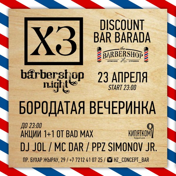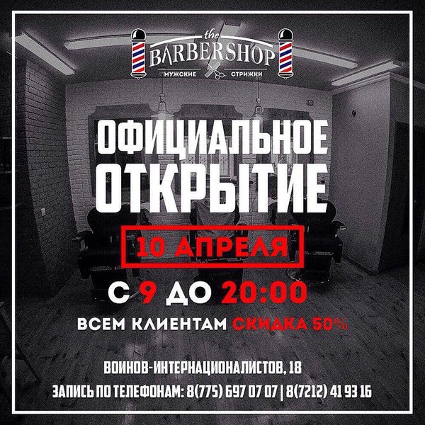 10 АПРЕЛЯ; The BARBERSHOP — — - 10 апреля, Официальное открытие,первой в Караганде, мужской парикмахерской «The BARBERSHOP» — — - Мы дарим вам хорошую и уютную атмосферу и в день открытия всем клиентам 50% скидку на все услуги!!! — — - Адрес: Воинов-Интернационалистов, 18 По записи: barberskz