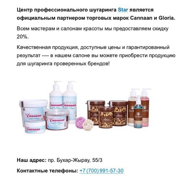 Жулдызай Кадарменова (01.02.2016): Для всех мастеров и салонов красоты предоставляем акцию со скидкой 20% на бренды Cannaan и Gloria ️ ️ ️