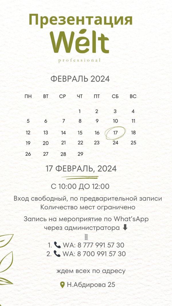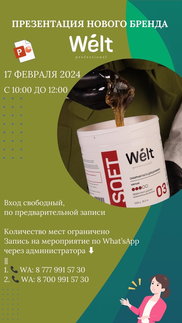 ке эпиляции Минимальный закуп, подарки, бонусы, бесплатные обучения, бизнес -программы, раздаточный материал, поддержка и помощь в работе мастера. ⠀ Все это и не только ждёт вас на презентации Welt Professional @welt.kz ⠀ По окончанию сертификат и приятности от бренда для участников презентации ⠀ ️Есть ещё свободные места, так что не упустите возможность записаться и стать частью этого незабываемого события. ⠀ Ждем вас ⠀ Запись на мероприятие по What’sApp через администратора ️ ⠀ 1. WA: 8 777 991 57 30 2. WA: