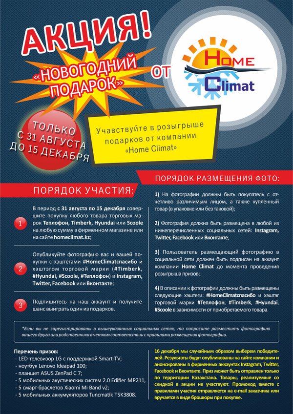 те компании. Внимание: Приз может быть отправлен только по территории Казахстана. Данные условия будут проверяться в случае победы. Если они не выполнены, то розыгрыш будет проведен повторно. Монтаж кондиционера победитель производит за свой счет. Подробнее о призе -