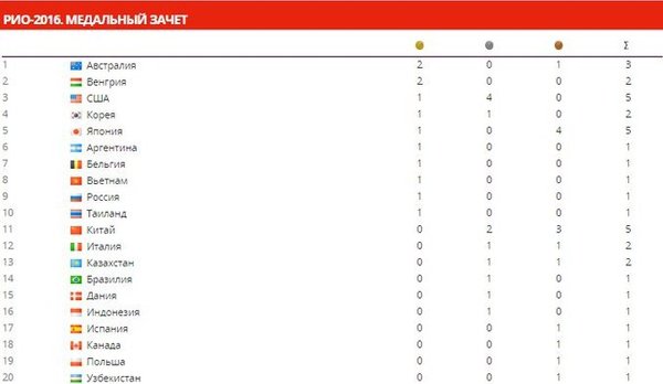 Медальный зачет летних Олимпийских игр после первого дня соревнований. Ждем первого золота от наших