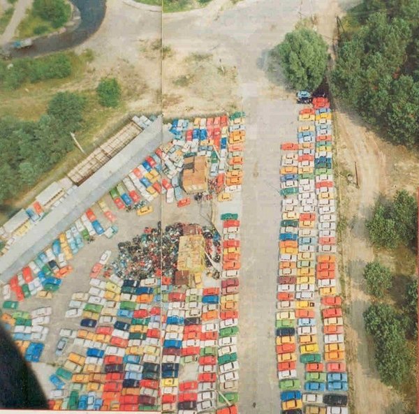Стоянка брошенных Жигулей, Москвичей и мотоциклов. Чернобыль, 1986 год.