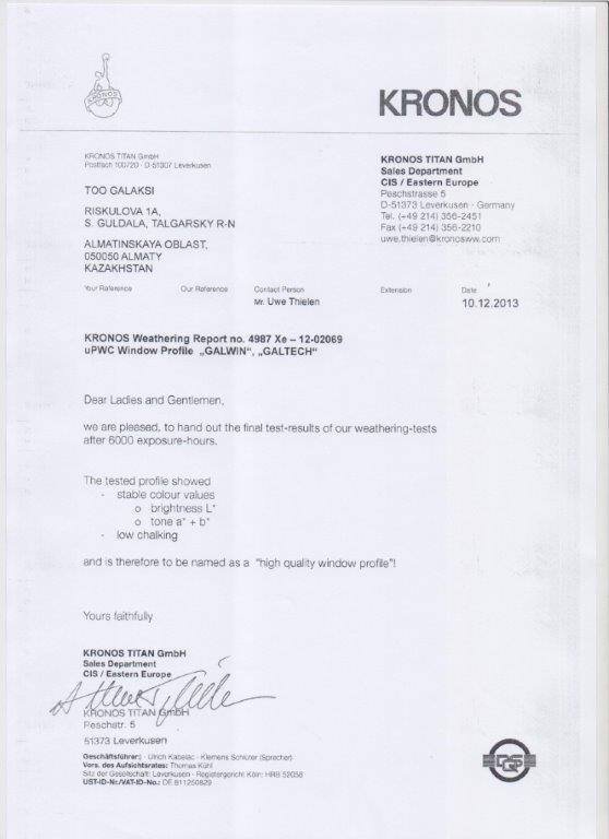 Профили торговых марок «Galwin» и «Galtech» в течение 6000 тысяч часов проходили испытание на качество проведенном компанией «Kronos» (Германия) и к концу испытаний показали отличные результаты и получил положительные отзывы, как профиль высокого качества.