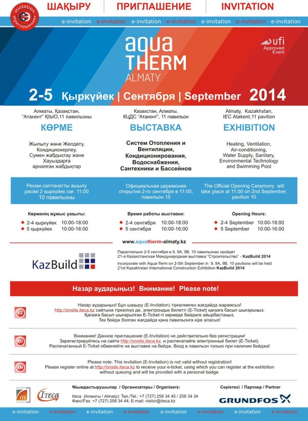 Уважаемые клиенты! Приглашаем Вас посетить наш стенд (г. Алматы, ВК «Атакент», павильон № 9, стенд № 353) в рамках выставки AquaTherm-2014, которая будет проходить 2—5 сентября 2014 г. Информируем Вас о том, что данное приглашение требует регистрации. Для этого Вам/Вашим клиентам/партнерам необходимо пройти на сайт по ссылке, выбрать в списке выставку AquaTherm2014 и внести свои данные, на почту будет направлен электронный билет, который необходимо распечатать и на выставке обменять на бейдж visitor, который будет давать право бесплатного вхо… — Читать дальше