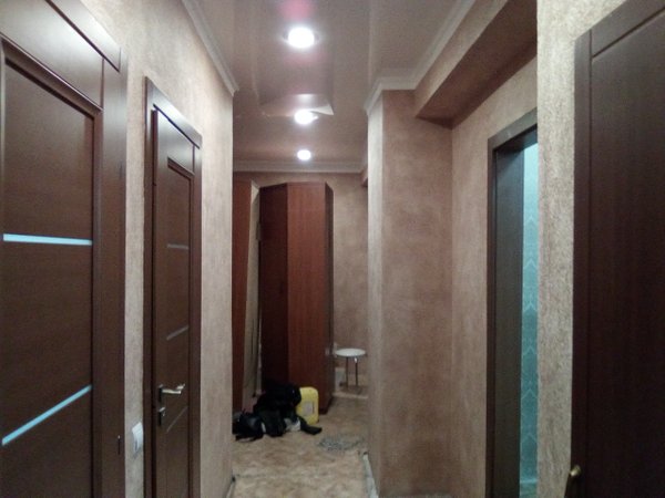 едварительная покраска алкидной эмалью ПФ-115 тоже была главным условием, потому как одно из стен была сделана из гипсокартона. В будущем без предварительной обработки эта стена могла дать желтые пятна на жидких обоях даже темного цвета. Другие стены были тоже слишком подозрительными, чтобы не обрабатывать их защитой. Так как я даю гарантию на свою работу, я всегда стараюсь класть защиту в один или два слоя. Почему ПФ-115? Дело в том, что я обжегся не так давно, когда использовал резиновую краску Гизогрунт производителя «Белый дом». Даже два слоя этой защиты меня не спасли от желтых пятен. Сам по себе Гизогрунт дороже алкидной эмали, но он дороже в полтора раза. Мне пришлось резко вернуться к использованию ПФ-115 как к самой эффективной защите жидких обоев. Поэтому у меня сейчас есть вопрос к «Белому Дому». Отчего испортилось качество вашего некогда отличного материала Гизогрунта? Когда я красил ПФ-115 оба коридора, использовал респиратор. Но вонь стояла несусветная. К счастью, через несколько дней резкий запах ушел. Я приготовил жидкие обои за сутки до его использования, а работать начал с торцевой стены. За несколько дней работа была закончена. Особо тяжко было выравнивать припотолочный ригель. На углах я всегда использую два шпателя, чтобы придать углу 90 градусов из жидких обоев идеальную форму. Этапы работы можно наблюдать на фото и видео. Щедро делюсь.