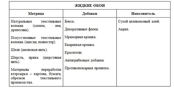 ративные флоки. — мраморная крошка. — кварцевая крошка. — красители. — антигрибковые добавки. — противопожарная пропитка. Армировочный наполнитель: — целлюлозный клей в сухом виде. — акрил. (Имеет жидкую субстанцию). Таким образом, жидкие обои состоят из основных компонентов – матрицы и наполнителя. Добавки же не всегда составляют матрицу, но они улучшают ее физические и эстетические свойства, что в свою очередь влияет на конечную цену продукта. Вода. Это важная составляющая для работы с жидкими обоями. Я включаю ее отдельным пунктом, потому что это своего рода кнопка-автомат, временный самый важный компонент, под воздействием которого сухая смесь жидких обоев приобретает совершенно иное свойство. Жидкие обои становятся пластичными и доступными для нанесения на стены. И в то же время при выветривании матрица приобретает прочные свойства, которая создает новую эстетику для помещения. Подробнее о компонентах жидких обоев смотрите в словаре терминов Глава 6.4 моей книги. Для удобства данные о составе жидких обоев занесены в таблицу.