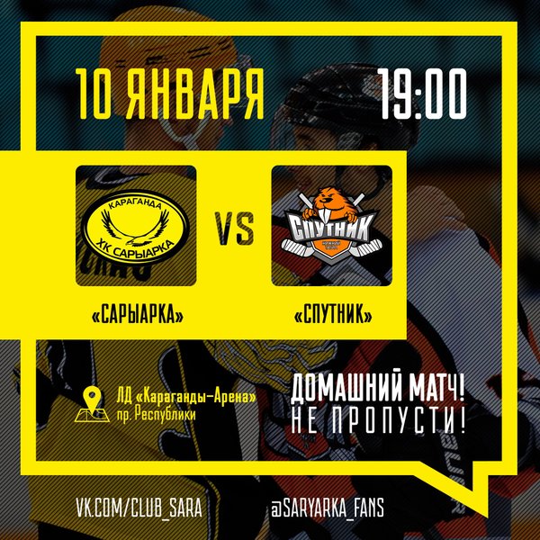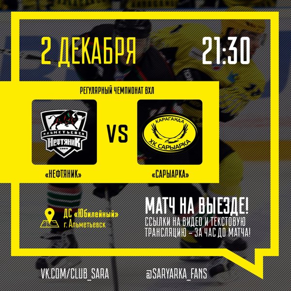 Болельщики ХК «САРЫАРКА» | Караганда | ВХЛ (01.12.2016): 2 декабря Сарыарка сыграет третий матч выездной серии с Нефтяником в Альметьевске. Нужен реванш! Удачи нашим Орлам!
