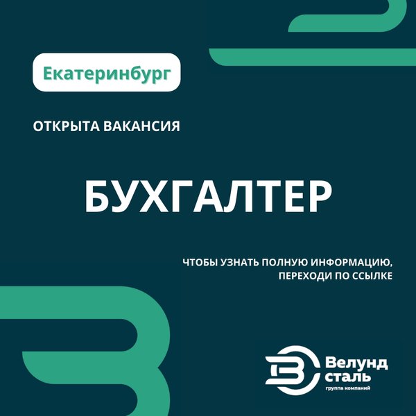 ГК «Велунд Сталь» приглашает в свою команду БУХГАЛТЕРА, г. Екатеринбург! Требуемый опыт работы: 1–3 года Полная занятость, полный день Условия: => график: 5/2, 09:00—18:00; => оформление по ТК РФ; => г. Екатеринбург, ул. Мамина-Сибиряка 101 => стабильная компания; => заработная плата по результатам собеседования (от 40000 руб) Полную информацию о вакансии можно узнать по ссылке