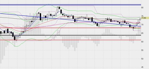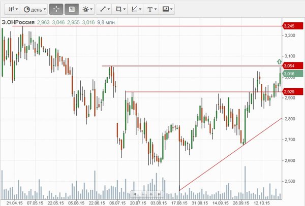 Бумаги Э.ОНРосси торгуются в восходящем тренде в последние два месяца. Мы рекомендуем открывать позиции в соответствии с данным трендом при пробитии локального сопротивления на уровне 3,054 руб. за акцию. Целью данного движения будет уровень 3,245 руб. за акцию. Стоп-лосс мы рекомендуем выставлять на уровне 2,93 руб. за акцию.