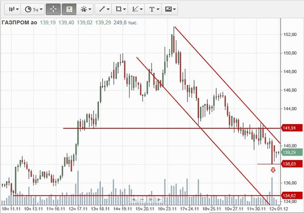 Бумаги Газпрома торгуются в краткосрочном нисходящем тренде. Мы рекомендуем открывать короткие позиции в направлении тренда при пробитии локального минимума на уровне 138 руб. за акцию. Целью движения может стать уровень 134,65 руб. за акцию. Стоп-лосс мы рекомендуем выставлять на уровне 141,9 руб. за акцию
