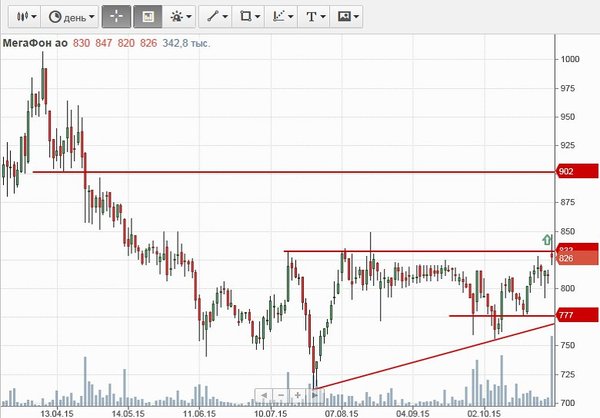 Бумаги Мегафон торгуются в восходящем тренде в последние три месяца. Мы рекомендуем открывать длинные позиции при пробитии и закреплении выше уровня 833 руб. за акцию. При реализации данного сценария целью движения станет уровень 902 руб. за акцию. Стоп-лосс рекомендуем выставлять на уровне 777 руб. за акцию.