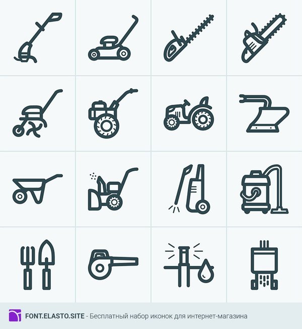 Иконочный шрифт ELASTO FONT — Иконки для сайта (14.02.2018): Доступны новые иконки для интернет-магазина по теме «Садовая техника и инструменты». Данный набор иконок уже встроен в ЭЛЕКТРОСИЛУ и MINIMARKET. Для использования нужно только использовать символьные коды, указанные на сайте