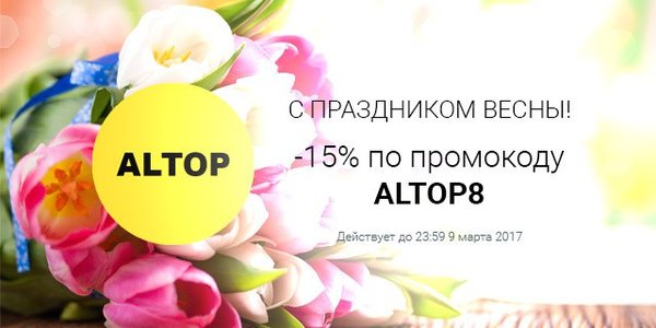 Поздравляем всех с праздником весны! Весна — время возрождения и пробуждения природы. Желаем всем успехов в новых начинаниях По промокоду ALTOP8 вы сможете получить скидку в 15% на все услуги и продукты на сайте altop.ru. Акция действует только 9 марта 2017 до 23:59.
