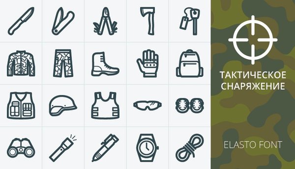 Иконочный шрифт ELASTO FONT — Иконки для сайта (22.02.2018): Доступны новые иконки для интернет-магазина по теме «Тактическое снаряжение». Данный набор иконок уже встроен в ЭЛЕКТРОСИЛУ и MINIMARKET. Для использования нужно только использовать символьные коды, указанные на сайте