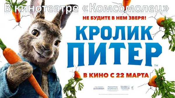 Кинотеатр «Комсомолец » ждет Вас на новый фильм о приключениях маленького и непоседливого крольчонка по имени Питер, который хочет пробраться в огород к грозному фермеру и вдоволь полакомиться там фруктами и овощами.