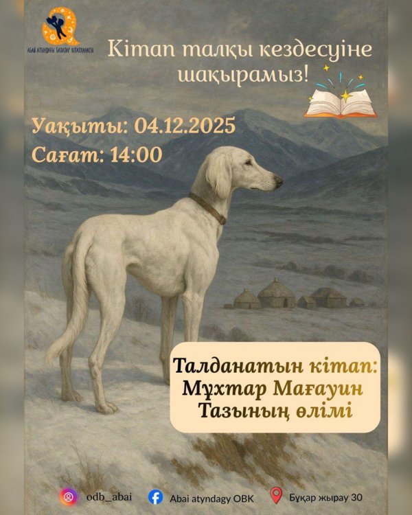 Құрметті оқырман қауым! Сіздерді қызықты кітап талдауға шақырамыз! Бұл жолы М. Мағауиннің “Тазының өлімі” повесін талдаймыз. Кездесуде: — Шығарманың идеясы мен көтерген мәселелерін талқылаймыз — Кейіпкерлерді, оқиғалар желісін бірге саралаймыз — Саятшылық өнердің қыр-сырына тоқталамыз. Келіңіздер, кітап әлеміне бірге саяхаттайық!