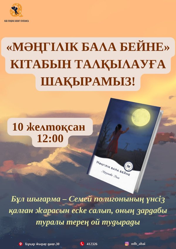 Белгілі драматург әрі жазушы Роза Мұқанованың XX ғасырдың қасіретті кезеңін терең суреттейтін әсерлі туындысы – «Мәңгілік бала бейне» кітабын талқылауға шақырамыз! Приглашаем на обсуждение книги Розы Мукановой «Мәңгілік бала бейне»! Произведение известной казахстанской писательницы и драматурга раскрывает трагические последствия Семипалатинского полигона и судьбу ребенка, оказавшегося в центре исторической драмы.