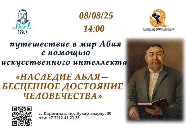 унанбаева. Модераторы научат ребят создавать «оживляющие» видео с помощью ИИ. Вас ждёт уникальное путешествие в мир Абая с помощью искусственного интеллекта! Не упустите возможность по-новому познакомиться с духовным наследием великого мыслителя! Приглашаем всех на это познавательное мероприятие! достар! 8 тамыз күні сағат 14.00-де кітапханада ұлы ақын Абай Құнанбайұлының 180 жылдығына арналған танымдық іс-шара өтеді. Шара барысында модераторлар балаларды жасанды интеллект көмегімен Абай әлеміне саяхат жасауды үйретеді. Жасанды интеллект арқылы Абай мұраларымен жаңаша танысып, рухани саяхат жасау мүмкіндігін жіберіп алмаңыз! Баршаңызды осы танымдық шараға шақырамыз! # жасандыинтеллект # Қарағанды Дорогие друзья! 8 августа в 14.00ч. в библиотеке состоится мероприятие, посвящённое 180-летию великого поэта и мыслителя Абая Кунанбаева. Модераторы научат ребят создавать «оживляющие» видео с помощью ИИ. Вас ждёт уникальное путешествие в мир Абая с помощью искусственного интеллекта! Не упустите возможность по-новому познакомиться с духовным наследием великого мыслителя! Приглашаем всех на это познавательное мероприятие!