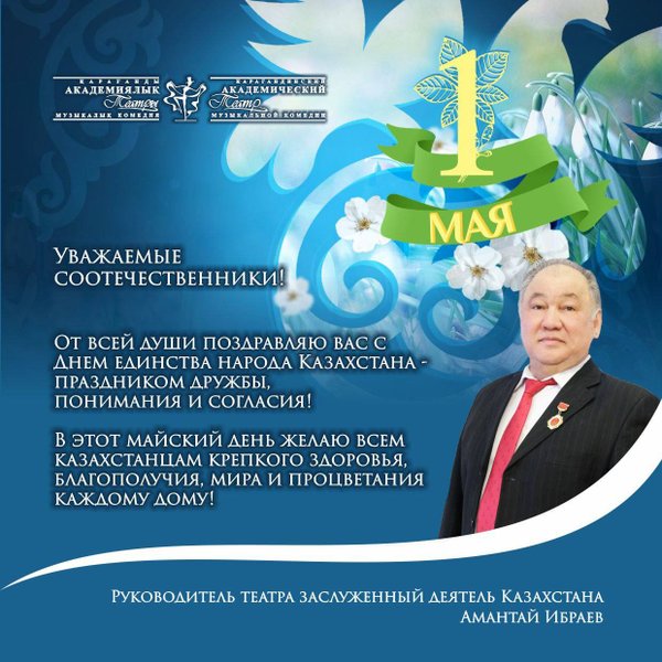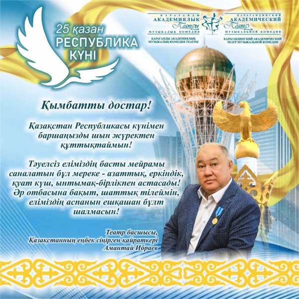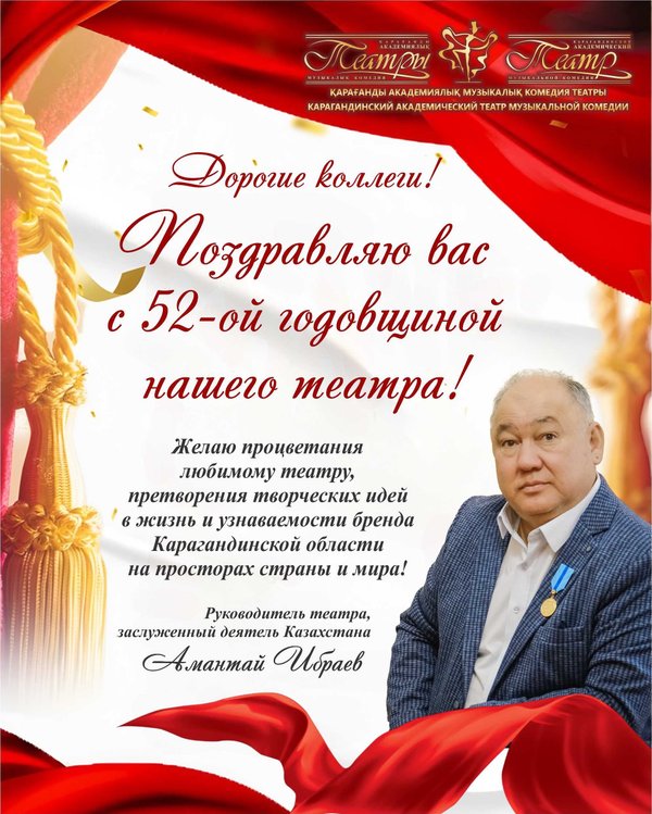 го здоровья, личного счастья и благополучия, дальнейших успехов в работе, творческого подъема и реализации смелых проектов, новых идей! С наилучшими пожеланиями Амантай Ибраев руководитель театра заслуженный деятель Казахстана
