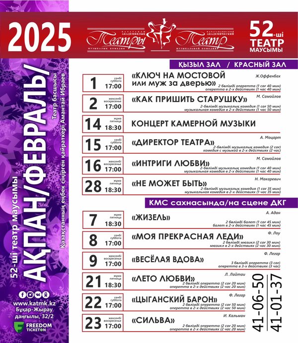 Карагандинский академический театр музыкальной комедии представляет репертуар на ФЕВРАЛЬ ️ Приобретайте билеты в кассе (пр.Бухар-Жырау, 32/2, тел. 41-06-50), заказывайте у администраторов по тел. 41-01-37 или онлайн на сайте «Тикетон»