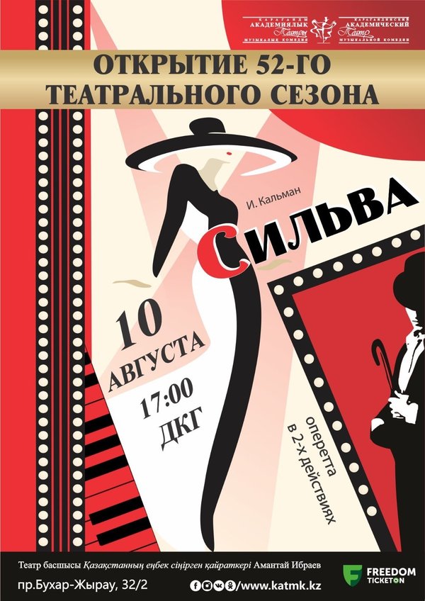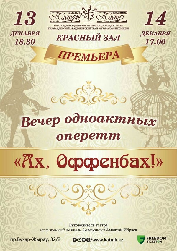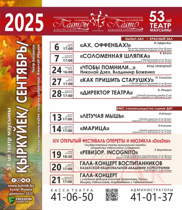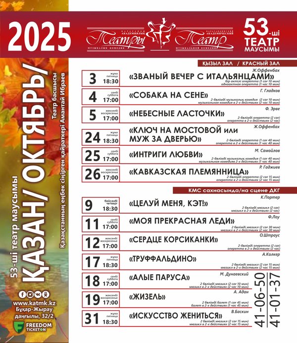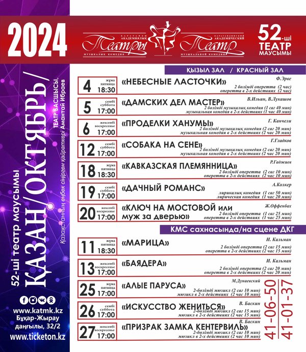 ️Қарағанды академиялық музыкалық комедия театры ҚАЗАН айына репертуар ұсынады. Билеттерді кассадан сатып алыңыз (Бұқар жырау даңғылы, 32/2, тел. 41-06-50), әкімшіден 41-01-37 телефоны арқылы немесе «Тикетон» сайтынан онлайн тапсырыс беріңіз. ️Карагандинский академический театр музыкальной комедии представляет репертуар на ОКТЯБРЬ Приобретайте билеты в кассе (пр.Бухар-Жырау, 32/2, тел. 41-06-50), заказывайте у администраторов по тел. 41-01-37 или онлайн на сайте «Тикетон»
