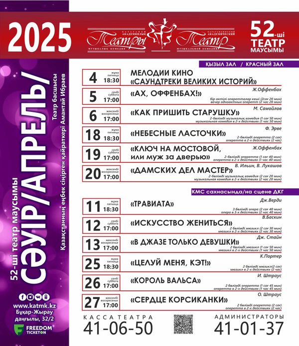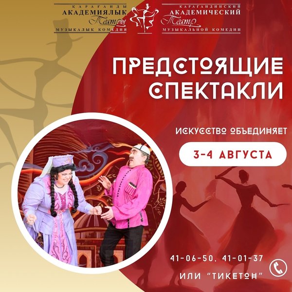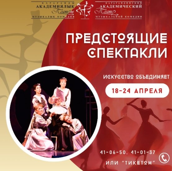️Қарағанды академиялық музыкалық комедия театры СӘУІР айына репертуар ұсынады. Билеттерді кассадан сатып алыңыз (Бұқар жырау даңғылы, 32/2, тел. 41-06-50), әкімшіден 41-01-37 телефоны арқылы немесе «Тикетон» сайтынан онлайн тапсырыс беріңіз. ️Карагандинский академический театр музыкальной комедии представляет репертуар на АПРЕЛЬ Приобретайте билеты в кассе (пр.Бухар-Жырау, 32/2, тел. 41-06-50), заказывайте у администраторов по тел. 41-01-37 или онлайн на сайте «Тикетон»