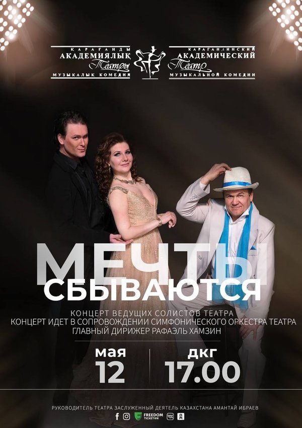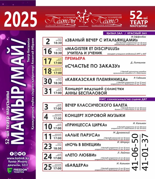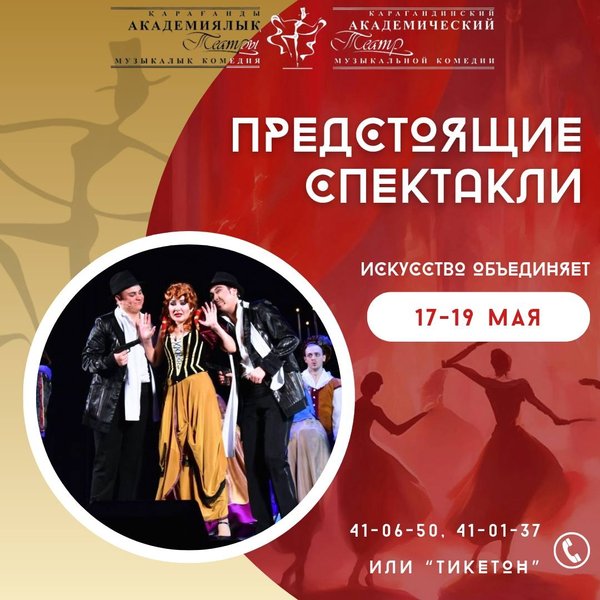 ️Қарағанды академиялық музыкалық комедия театры МАМЫР айына репертуар ұсынады. Билеттерді кассадан сатып алыңыз (Бұқар жырау даңғылы, 32/2, тел. 41-06-50), әкімшіден 41-01-37 телефоны арқылы немесе «Тикетон» сайтынан онлайн тапсырыс беріңіз. ️Карагандинский академический театр музыкальной комедии представляет репертуар на МАЙ Приобретайте билеты в кассе (пр.Бухар-Жырау, 32/2, тел. 41-06-50), заказывайте у администраторов по тел. 41-01-37 или онлайн на сайте «Тикетон»