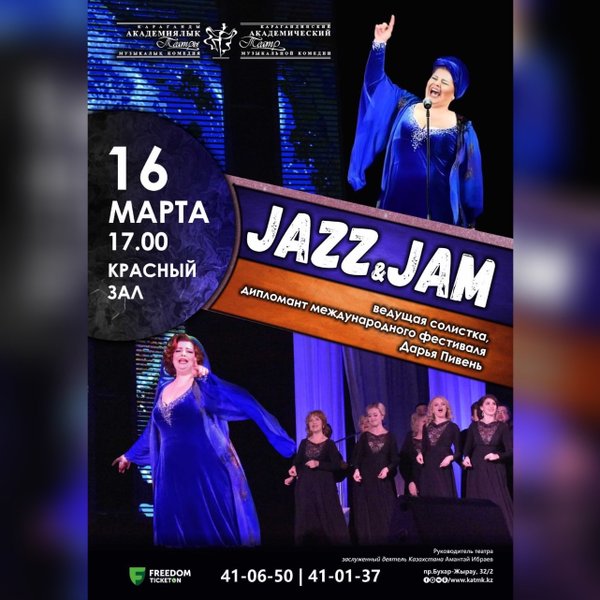 В первый весенний месяц наш театр подготовил для своих зрителей сюрприз – сольный концерт ведущей солистки КАТМК, дипломанта международного фестиваля Дарьи Пивень. Если вы любитель джаза, если вы поклонник творчества и голоса нашей замечательной актрисы и певицы, приходите на концерт, и этот вечер, благодаря прекрасной музыке и ощущению настоящего драйва, станет для вас поистине незабываемым! Приобретайте билеты в кассе (пр.Бухар-Жырау, 32/2, тел. 41-06-50), заказывайте у администраторов по тел. 41-01-37 или онлайн на сайте «Тикетон»
