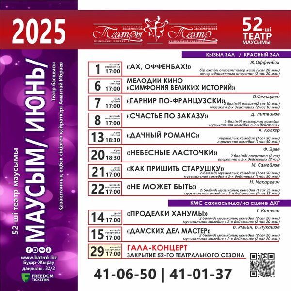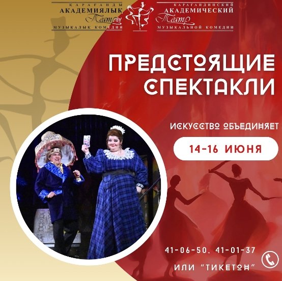 ️Қарағанды академиялық музыкалық комедия театры МАУСЫМ айына репертуар ұсынады. Билеттерді кассадан сатып алыңыз (Бұқар жырау даңғылы, 32/2, тел. 41-06-50), әкімшіден 41-01-37 телефоны арқылы немесе «Тикетон» сайтынан онлайн тапсырыс беріңіз. ️Карагандинский академический театр музыкальной комедии представляет репертуар на ИЮНЬ Приобретайте билеты в кассе (пр.Бухар-Жырау, 32/2, тел. 41-06-50), заказывайте у администраторов по тел. 41-01-37 или онлайн на сайте «Тикетон»