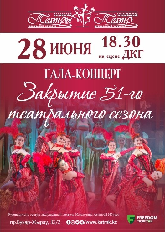 ПРИХОДИТЕ НА ГАЛА-КОНЦЕРТ, ПОСВЯЩЕННЫЙ ЗАКРЫТИЮ 51-ГО ТЕАТРАЛЬНОГО СЕЗОНА! Вы увидите лучшие концертные номера из оперетт, музыкальных комедий и мюзиклов! В концерте принимают участие солисты, артисты хора и балета и симфонический оркестр театра Приобретайте билеты в кассе (пр.Бухар-Жырау, 32/2, тел. 41-06-50), заказывайте у администраторов по тел. 41-01-37 или онлайн на сайте «Тикетон»