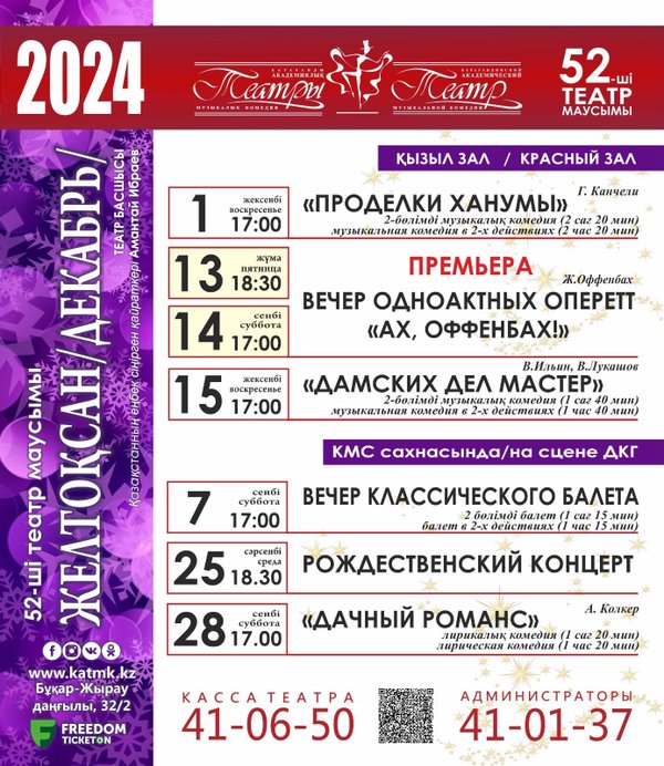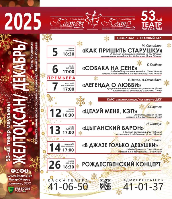 Қарағанды академиялық музыкалық комедия театры ЖЕЛТОҚСАН айына репертуар ұсынады. Билеттерді кассадан сатып алыңыз (Бұқар жырау даңғылы, 32/2, тел. 41-06-50), әкімшіден 41-01-37 телефоны арқылы немесе «Тикетон» сайтынан онлайн тапсырыс беріңіз. ️Карагандинский академический театр музыкальной комедии представляет репертуар на ДЕКАБРЬ. Приобретайте билеты в кассе (пр.Бухар-Жырау, 32/2, тел. 41-06-50), онлайн на сайте «Тикетон» или заказывайте у администраторов по тел. 41-01-37