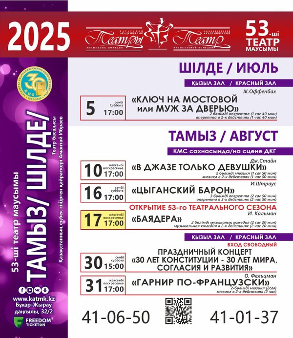 ️Қарағанды академиялық музыкалық комедия театры ШІЛДЕ/ТАМЫЗ айына репертуар ұсынады. Билеттерді кассадан сатып алыңыз (Бұқар жырау даңғылы, 32/2, тел. 41-06-50), әкімшіден 41-01-37 телефоны арқылы немесе «Тикетон» сайтынан онлайн тапсырыс беріңіз. ️Карагандинский академический театр музыкальной комедии представляет репертуар на ИЮЛЬ/АВГУСТ Приобретайте билеты в кассе (пр.Бухар-Жырау, 32/2, тел. 41-06-50), заказывайте у администраторов по тел. 41-01-37 или онлайн на сайте «Тикетон»