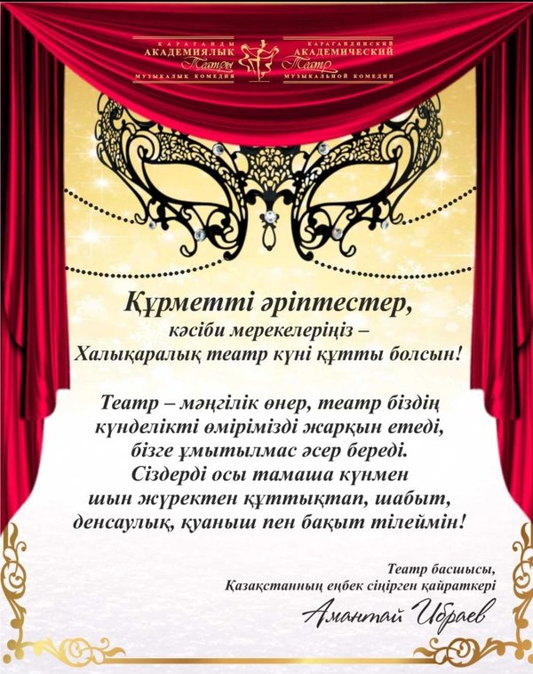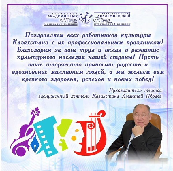 21 мая в Казахстане отмечается День работников культуры и искусства – тех, без кого немыслимо духовное и творческое развитие страны. Руководитель театра, заслуженный деятель Казахстана Амантай Ибраев обратился к коллегам с поздравлениями: — Поздравляем всех работников культуры Казахстана с их профессиональным праздником! Благодарим за ваш труд и вклад в развитие культурного наследия нашей страны! Пусть ваше творчество приносит радость и вдохновение миллионам людей, а мы желаем вам крепкого здоровья, успехов и новых побед!
